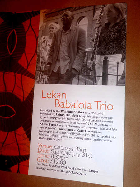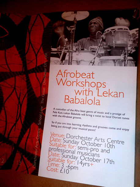 A high point of integration was reached in October when two Afrobeat Workshops were advertised - ‘If you are into learning rhythms and grooves come and enjoy being put through your musical paces!’ was the invitation - for ‘semi-pro and professional musicians’. I certainly am not in either of these categories, but Kate and Lekan were well aware of what I was doing by then, so when I asked if I could bring my women along just to listen in and enjoy the music, they readily agreed.