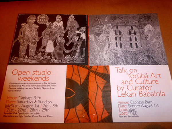 Used as I am now to remarkable synchronicities, this one took even me by surprise! Sorting through my emails on my return, what should I find but invitations to hear the Lekan Babalola Trio, of which I had been until that moment ignorant, barely 10 minutes from home, to see an exhibition of art works commissioned by the Ifa-Yoruba Contemporary Arts Trust from artists across the African Diaspora, and to go to a talk on Yoruba Art and Culture! An instantaneous answer to prayer.......