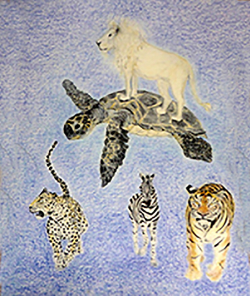 While the ceremony was actually happening, Susie Bruce, a supporter of the work and a gifted painter, tuned in from her home in Portugal and was engaged on an intuitive painting. Having been brought up in colonial Africa herself, and with an intimate connection with animals, her 'Sources of Power' (left) shows her shamanic awareness, and the picture on the right was the one painted during the ceremony.